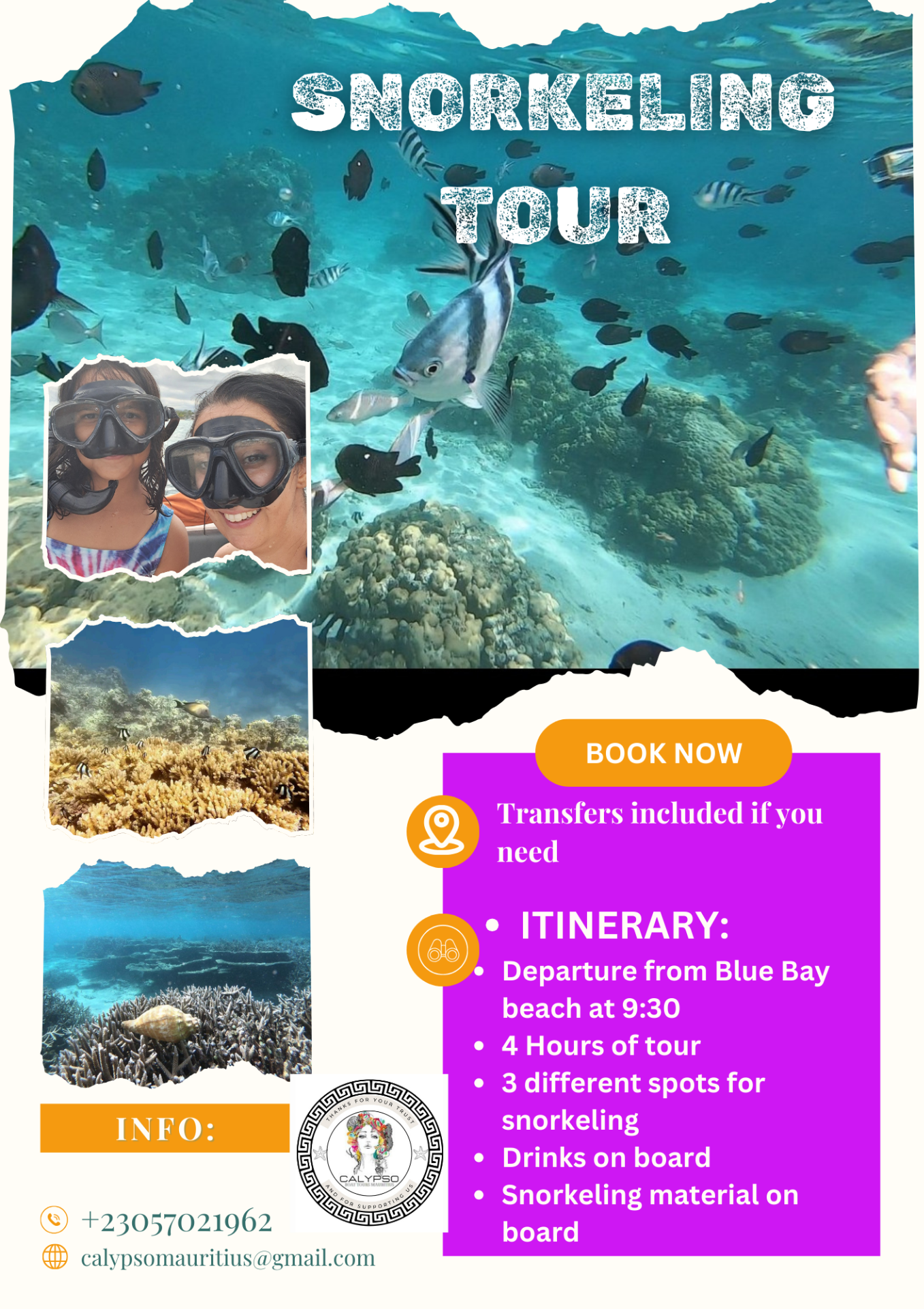 For snorkelling lovers, 4 hours of tour inside the lagoon, 3 different snorkeling sites. Drinks on board and local snacks. Departure from Blue Bay